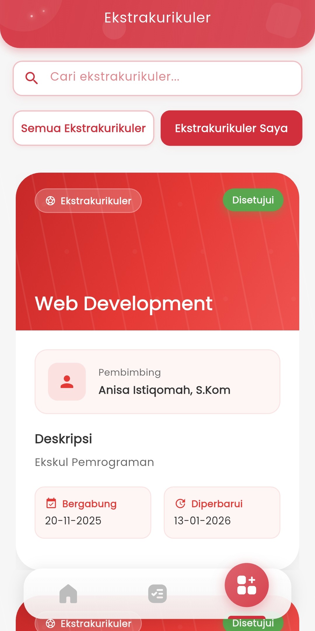 You can see a complete list of all extracurricular activities available at school. Each extracurricular is displayed in a card format containing: